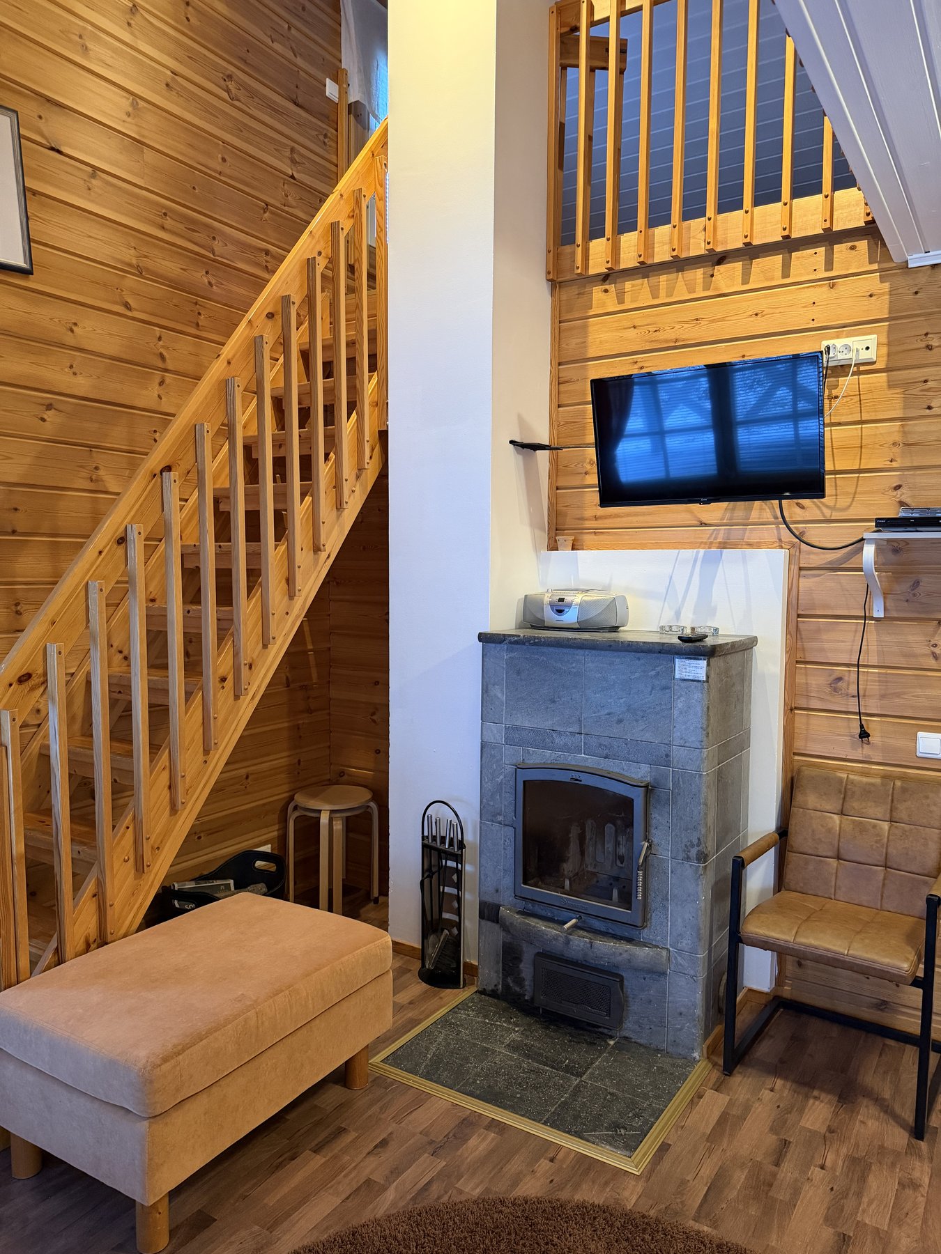 parivuoteella, sauna (sähkökiuas), pesuhuone ja erillinen wc. Yläkerran parviaulassa on