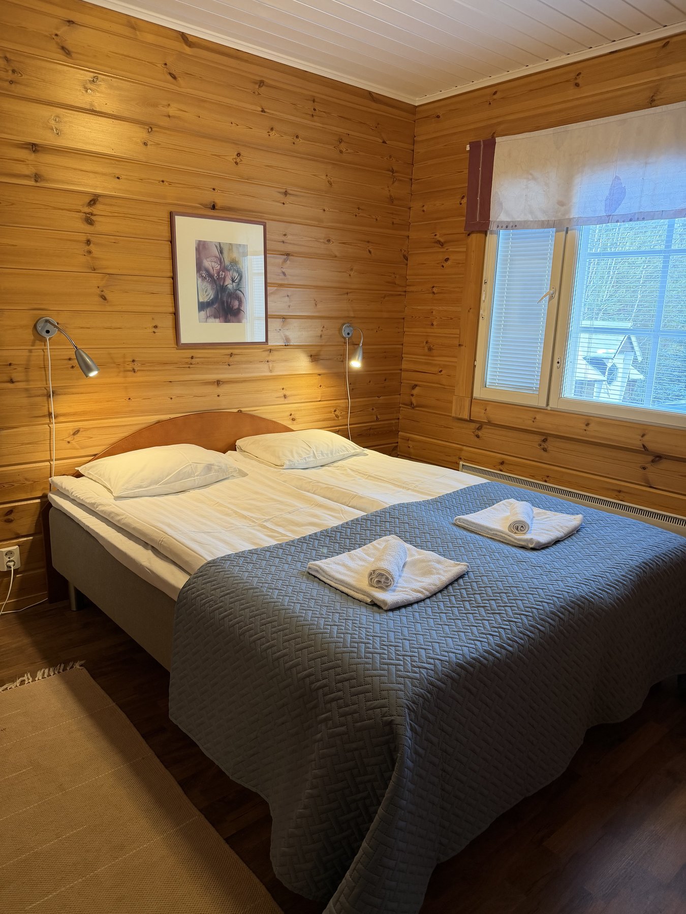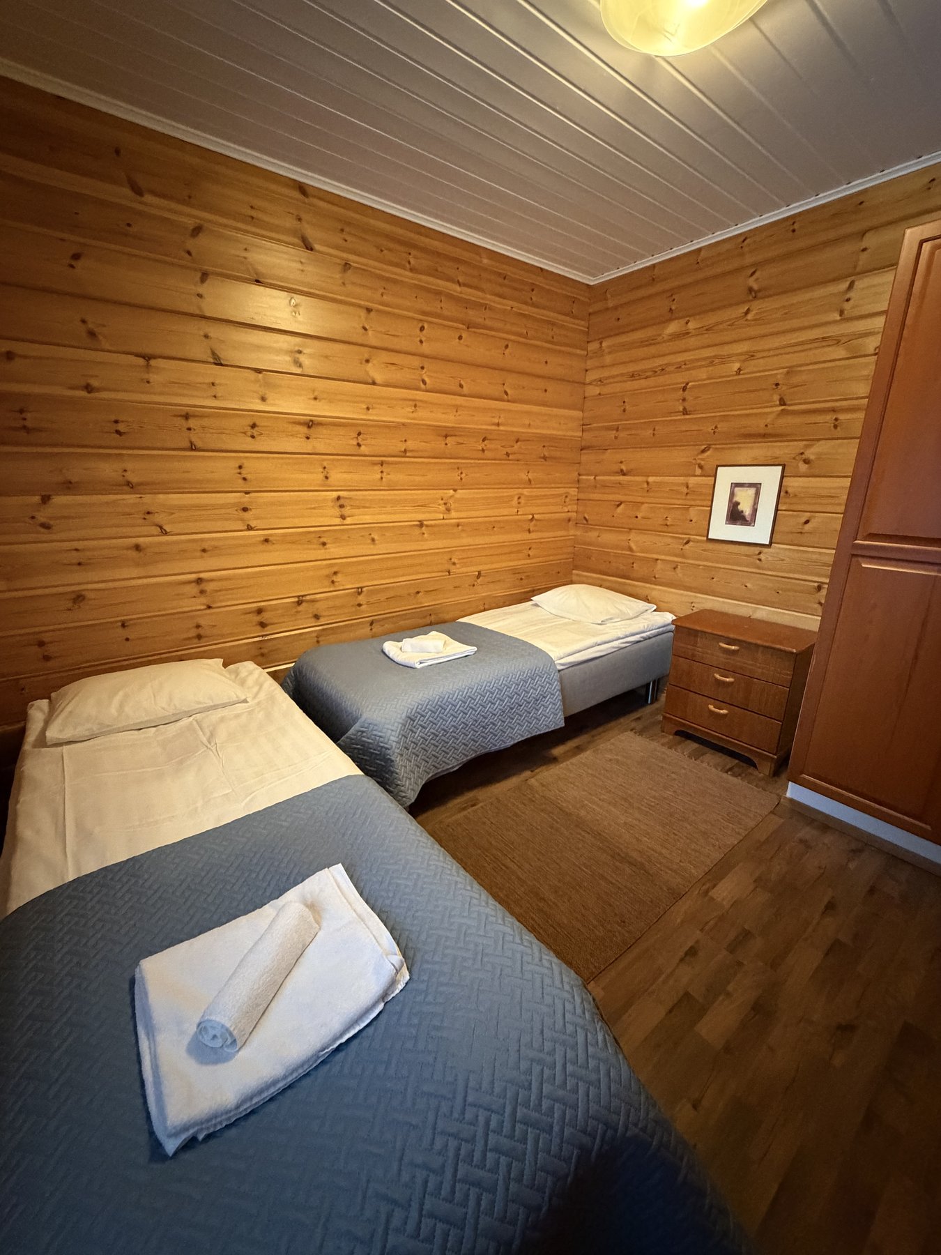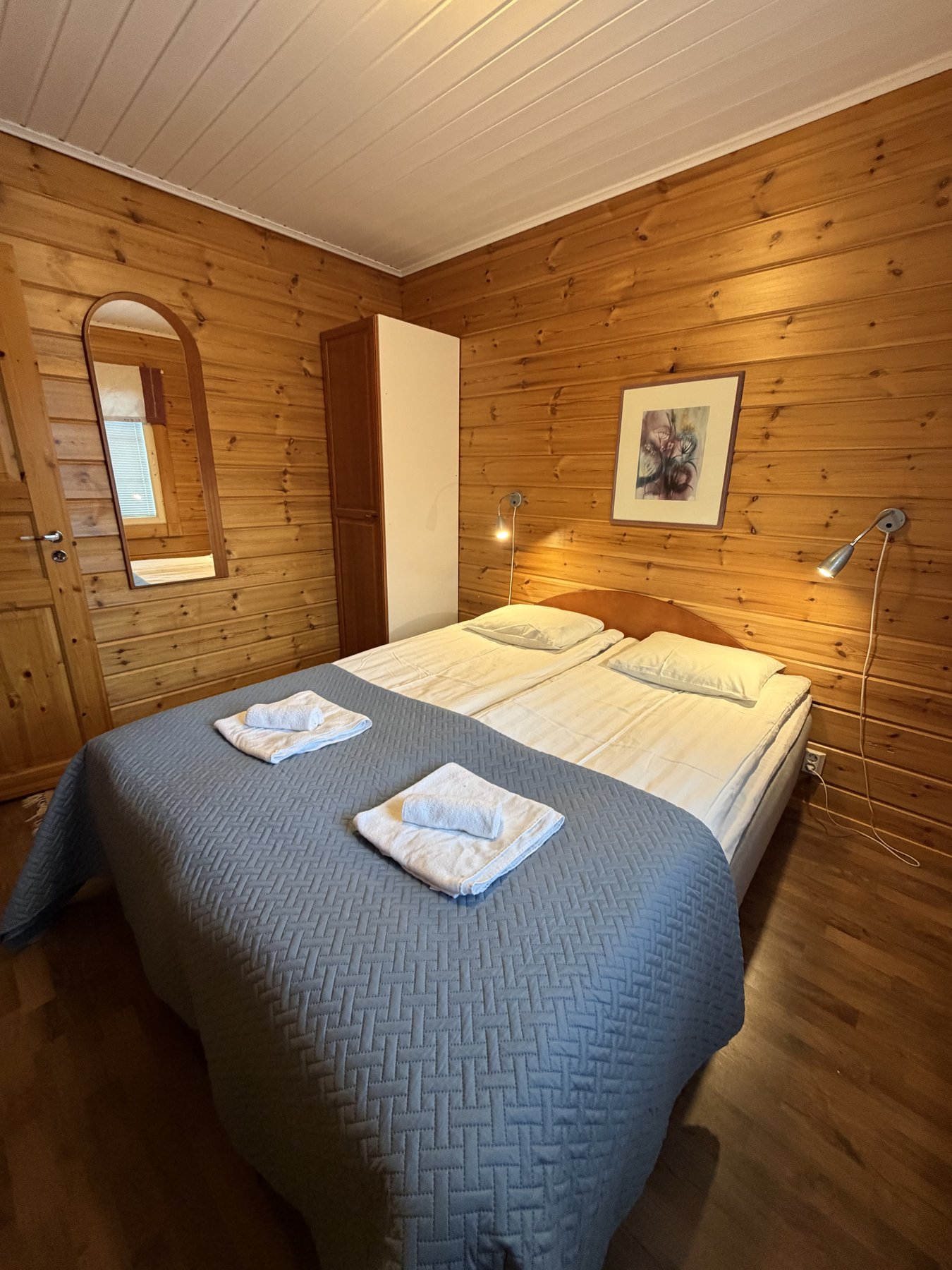 vuoteet kahdelle ja toisessa lisäksi yksi erillinen vuode. Suihku/wc yläkerrassa.