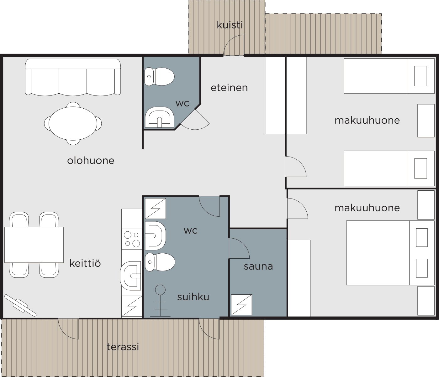 olohuone/keittiö, sauna, 2 WC:tä sekä terassi. Liinavaatteet sekä kohteen loppusiivous