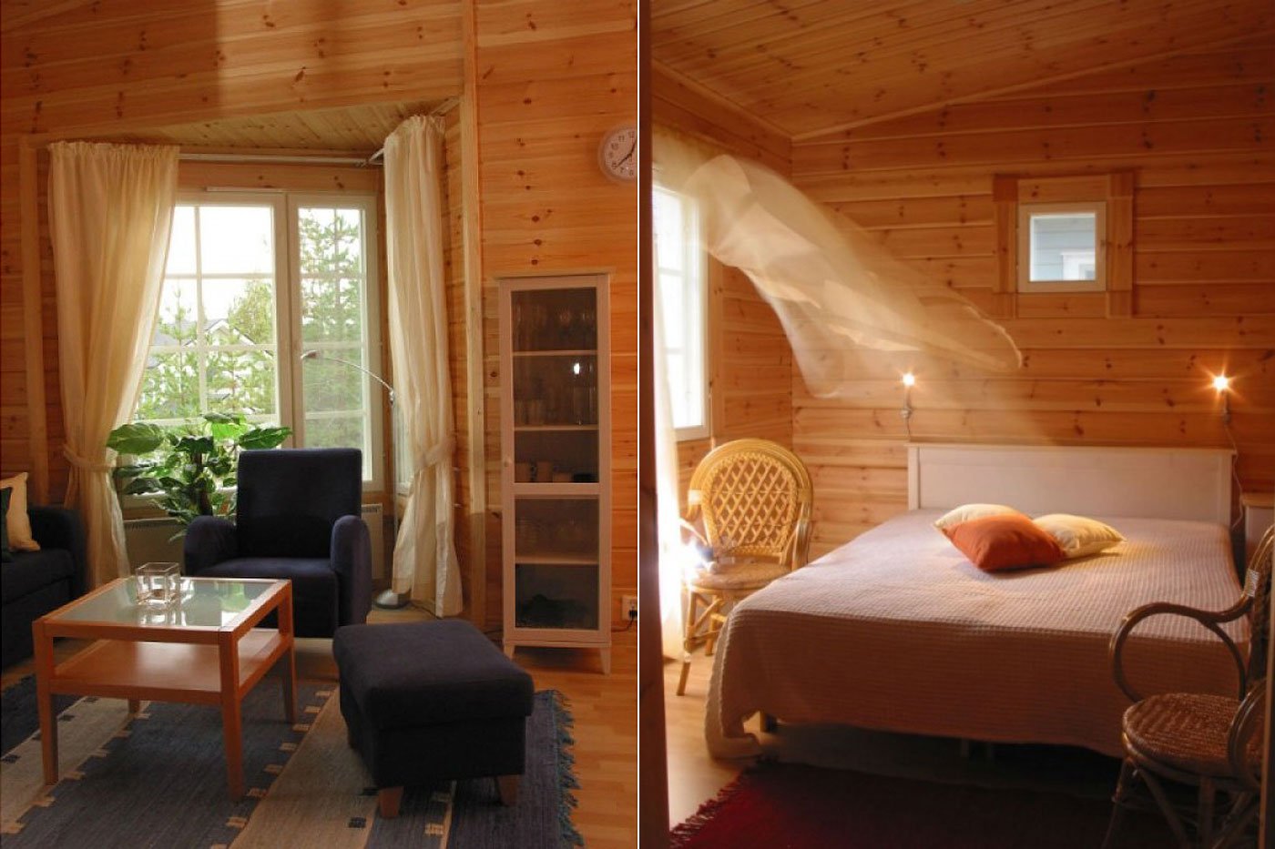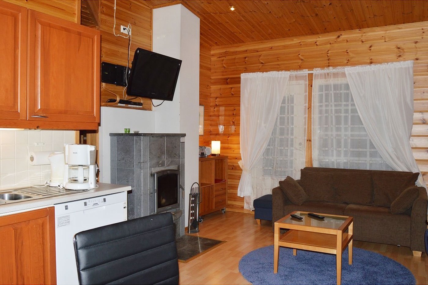 Huoneistossa on tupakeittiö vuodesohvalla, makuuhuone, jossa on kaksi vuodetta, sekä sauna