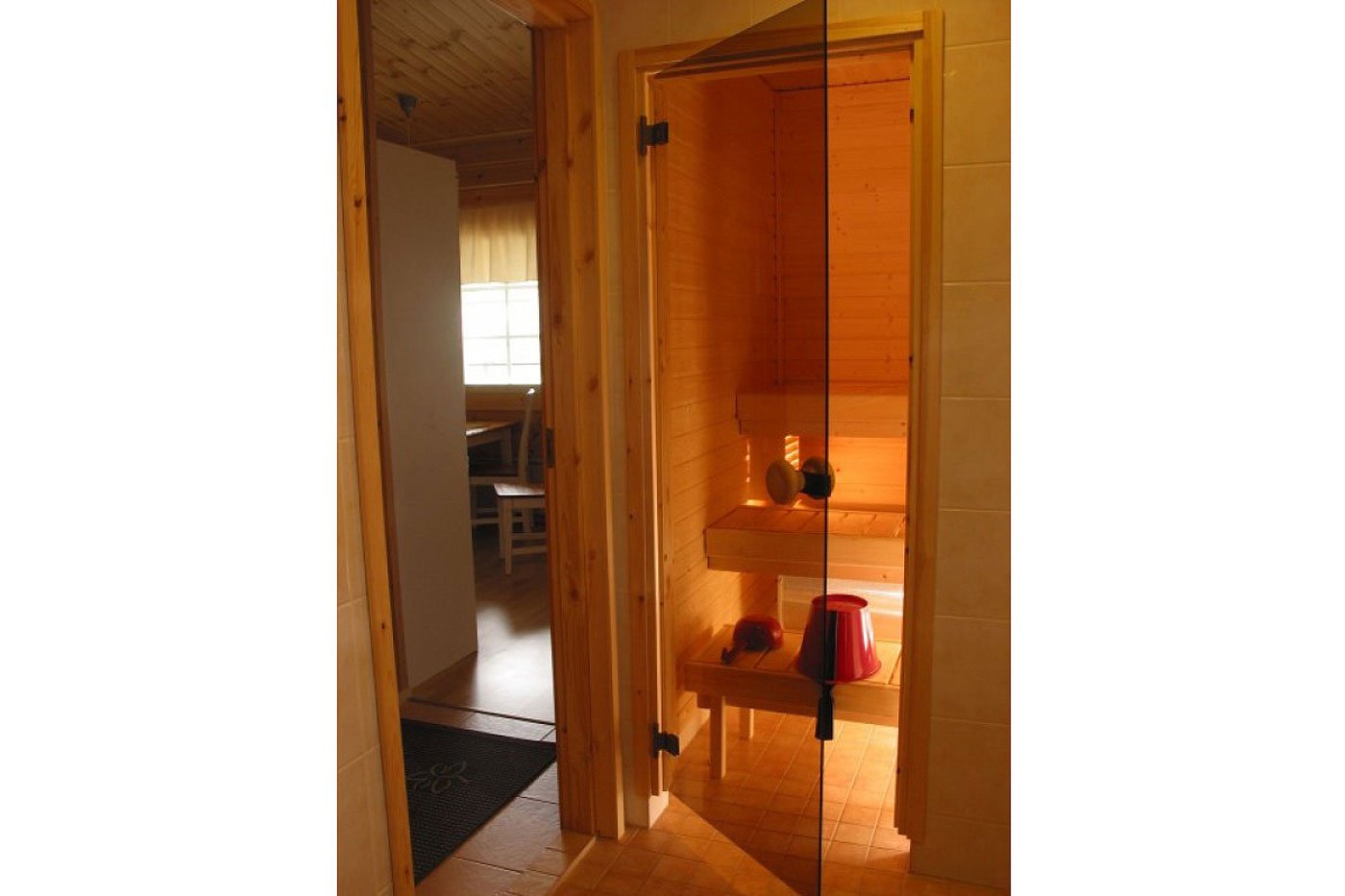 (sähkökiuas), suihku ja pesuhuoneen yhteydessä oleva wc. Takka luo tunnelmaa ja terassilla on