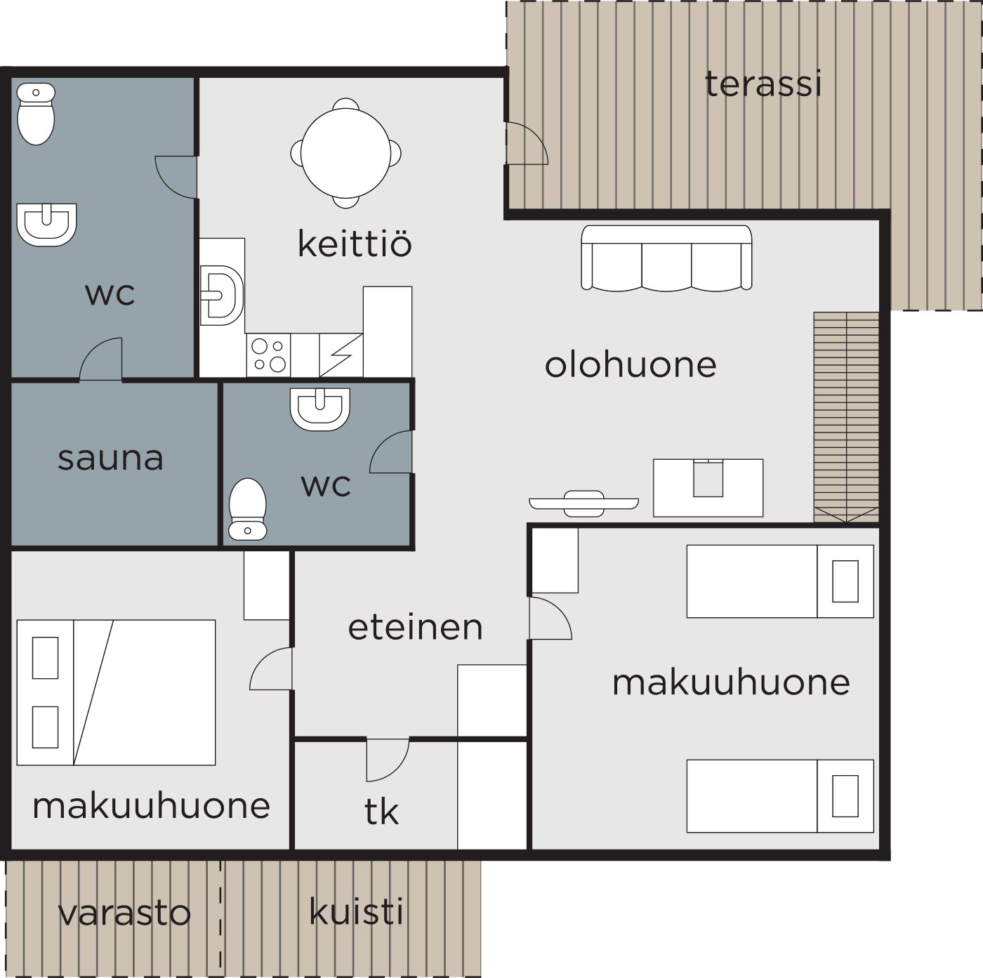kaksi erillistä vuodetta), sauna sähkökiukaalla, pesuhuone ja wc sekä erillinen toinen wc.
