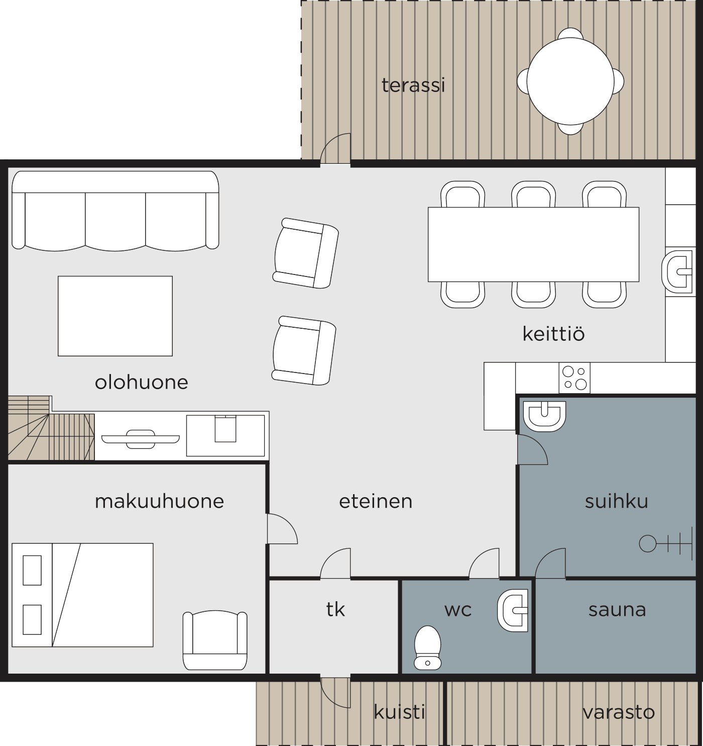 Alakerrassa sijaitsee tupakeittiö levitettävällä vuodesohvalla 1–2 hengelle, makuuhuone