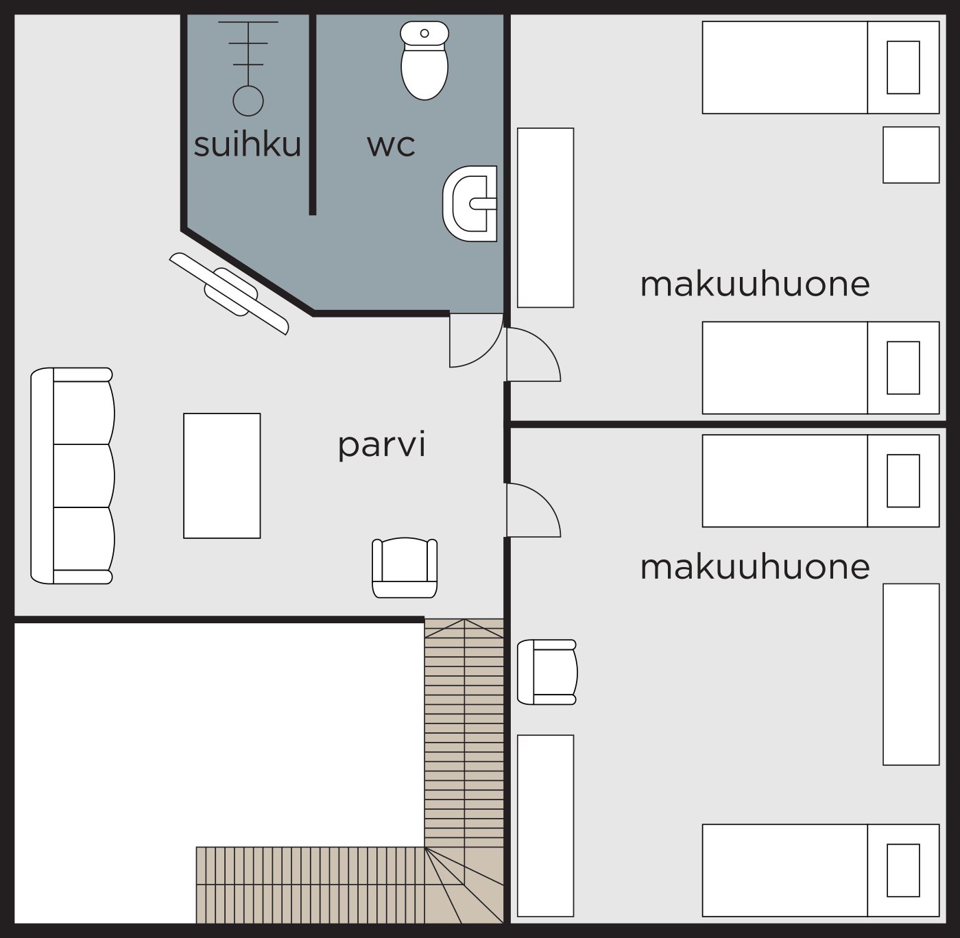 Huoneistossa on kolme makuuhuonetta ja parvi, yhteensä vuodepaikat 7 + 3 hengelle.